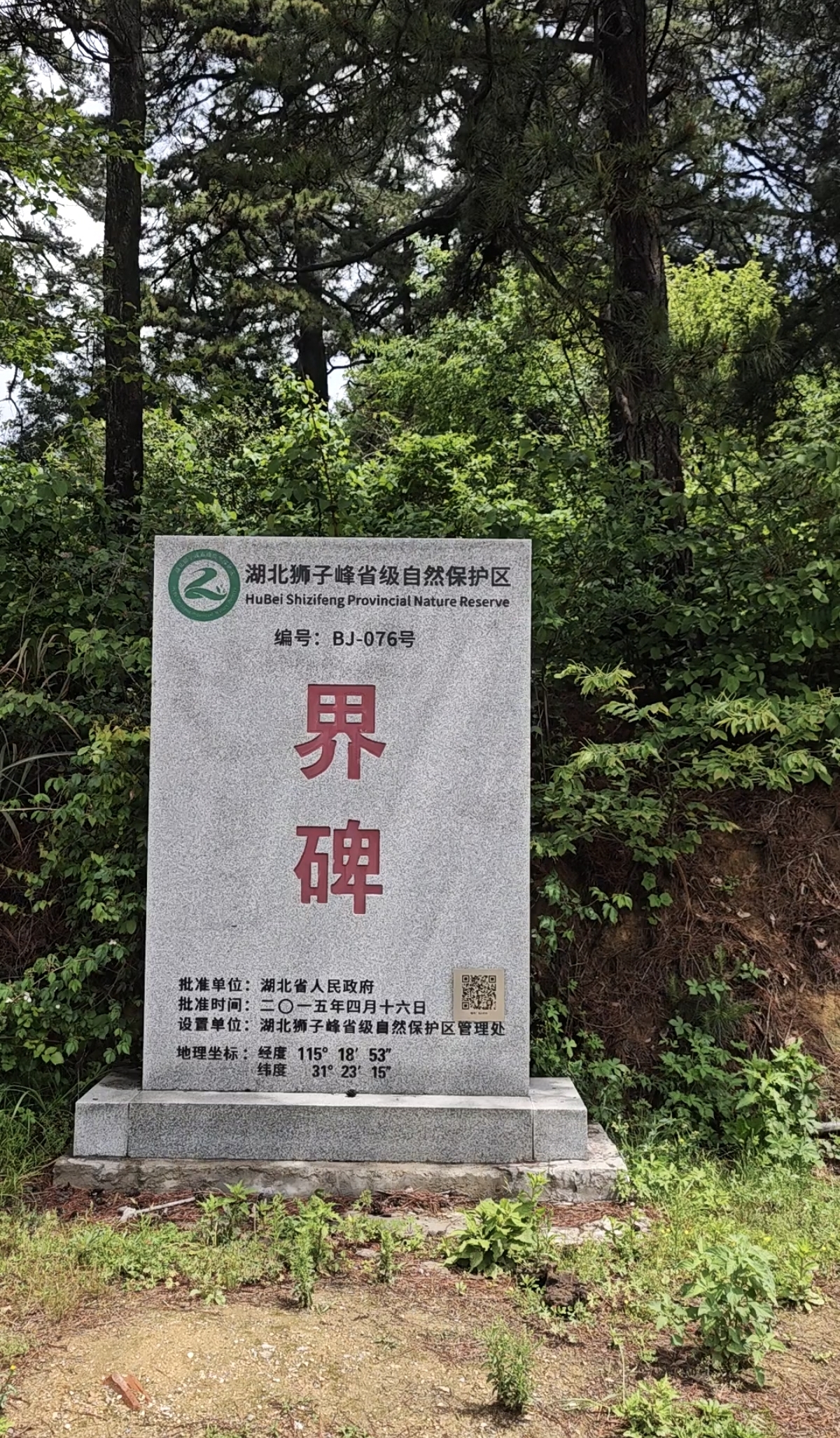 摘了快一个小时的果子,哈哈,才调头这次算是找到了对的路,整个路程都是盘山小路,虽然是七湾八拐的,但路修的很好很平整,车子开起来很舒服。在这样的山路开车无疑是一种行走美景中的惬意之行,就算出现在梦中也不会忘记拿手机拍照。行驶了约半个多小时,像是到了山顶,非常宽阔,映入眼帘是一块界碑,已然从安徽候踏入了湖北地界,此时身处湖北狮子峰省级自然保护区了。
